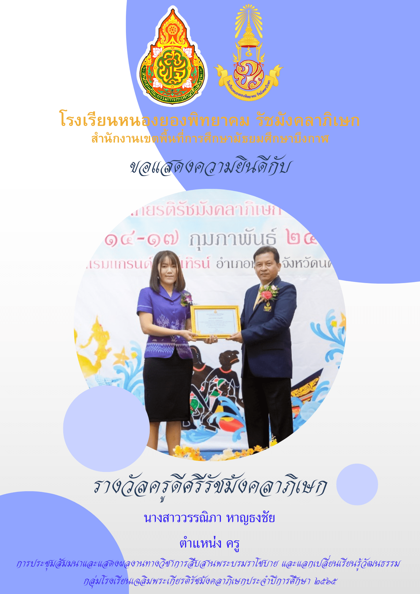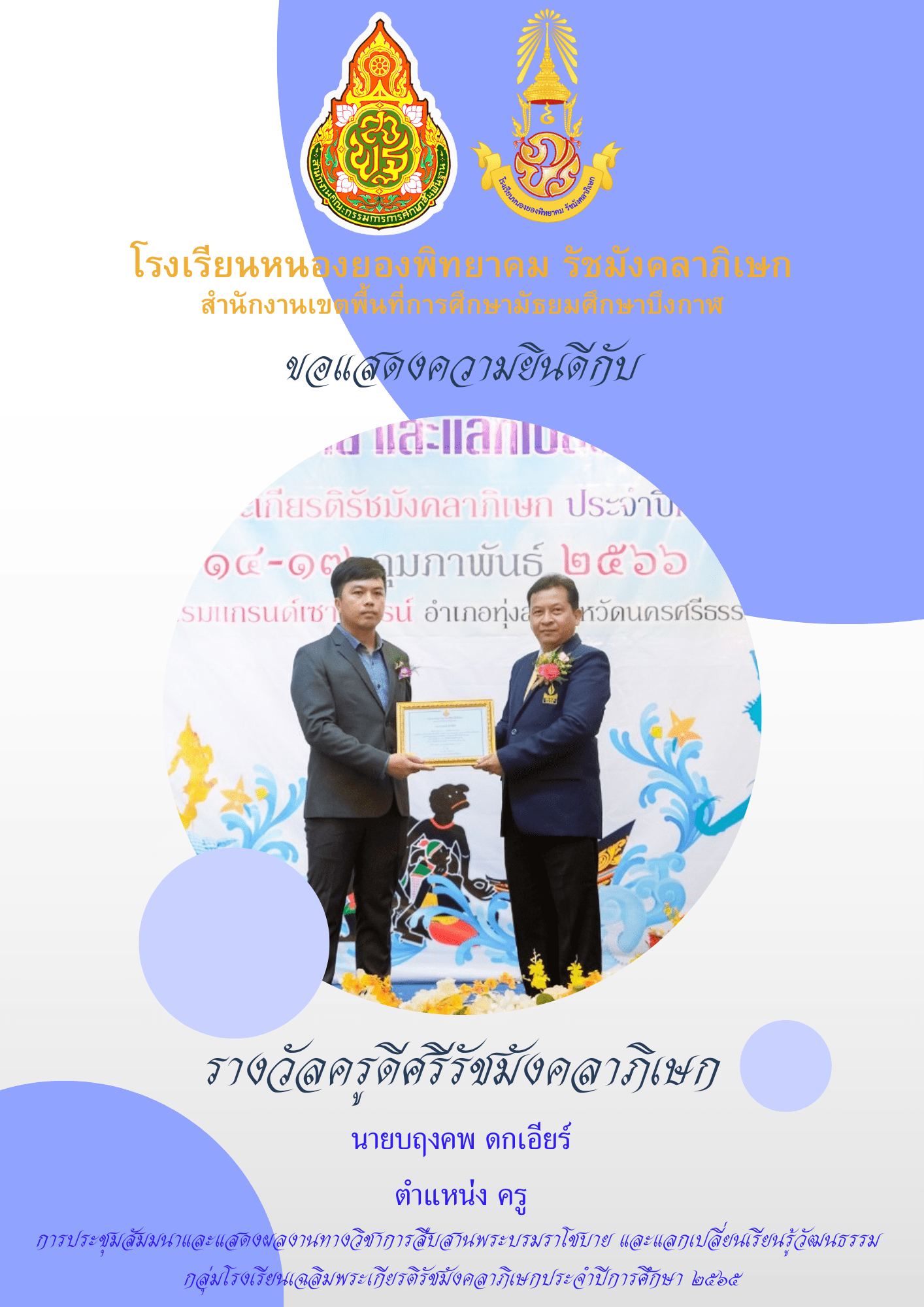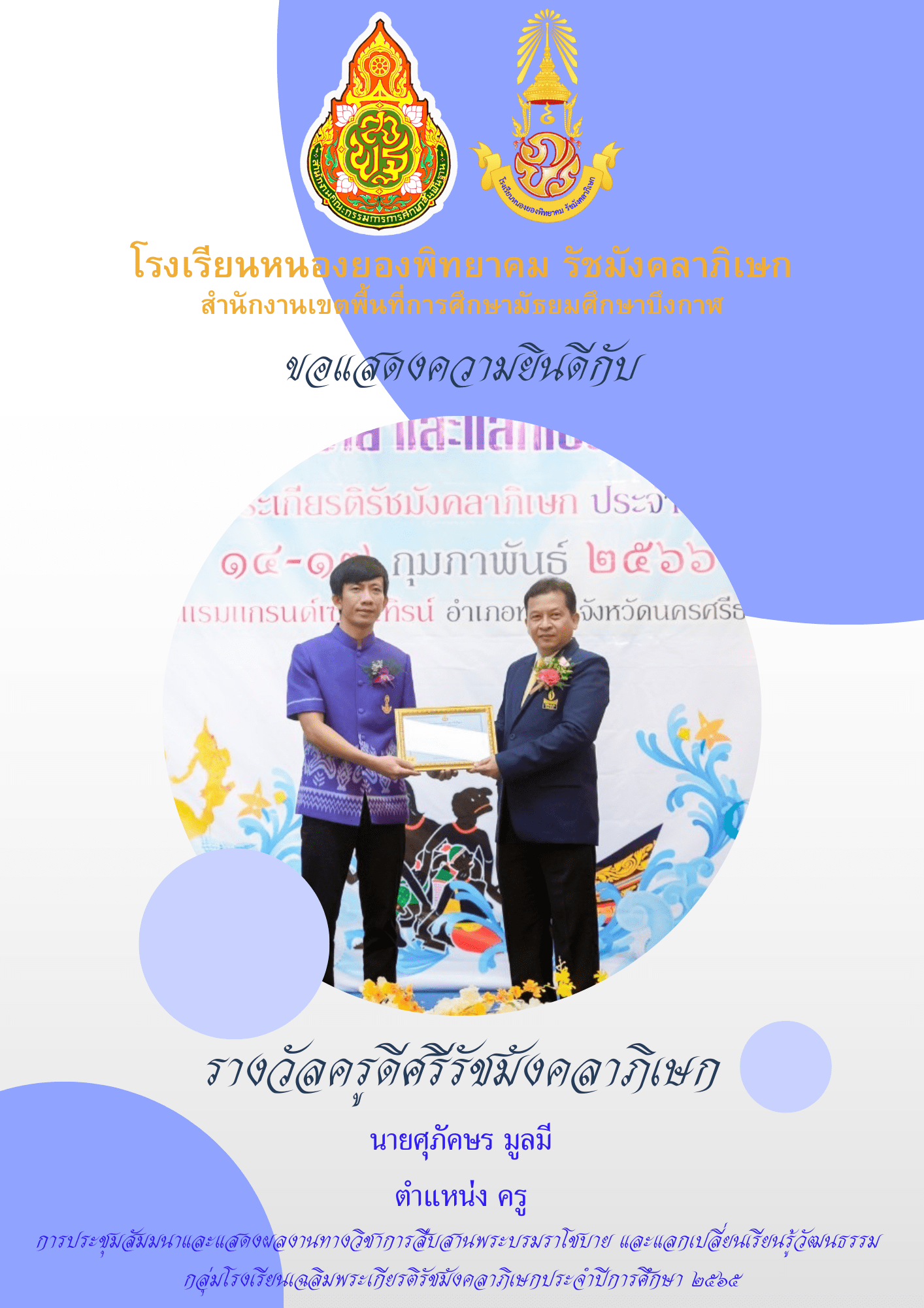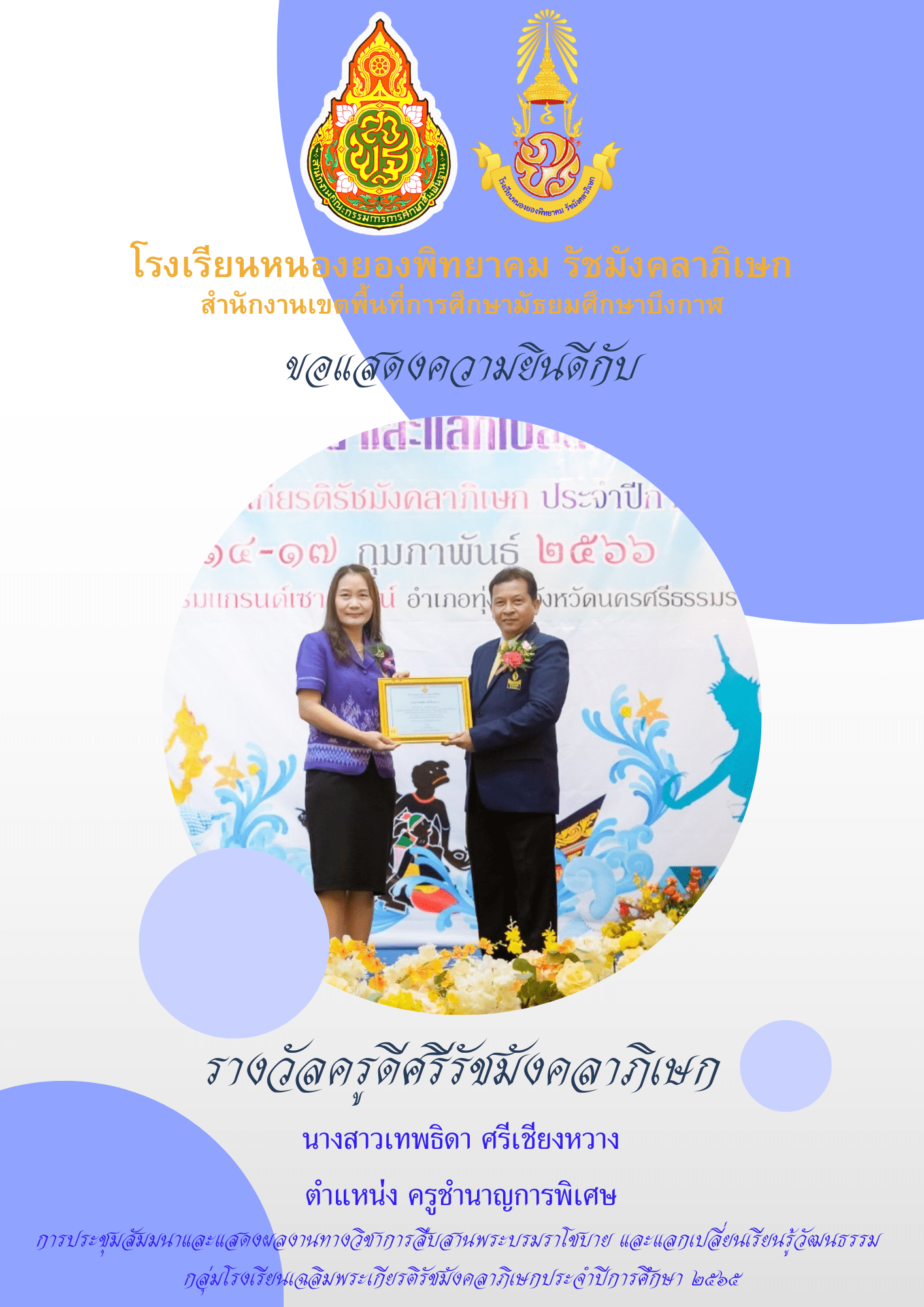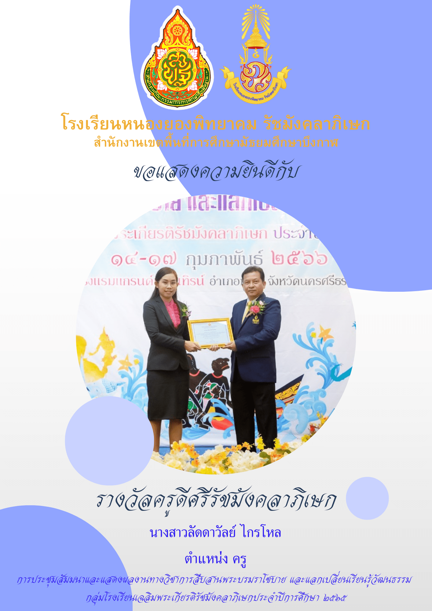 ขอแสดงความยินดีกับนางสาวเทพธิดา ศรีเชียงหวาง นางสาวลัดดาวัลย์ ไกรโหล นางสาววรรณิภา หาญธงชัย นายศุภัคษร มูลมี และนายบฤงคพ ดกเอียร์ ที่ได้รับรางวัลครูดีศรีรัชมังคลาภิเษก