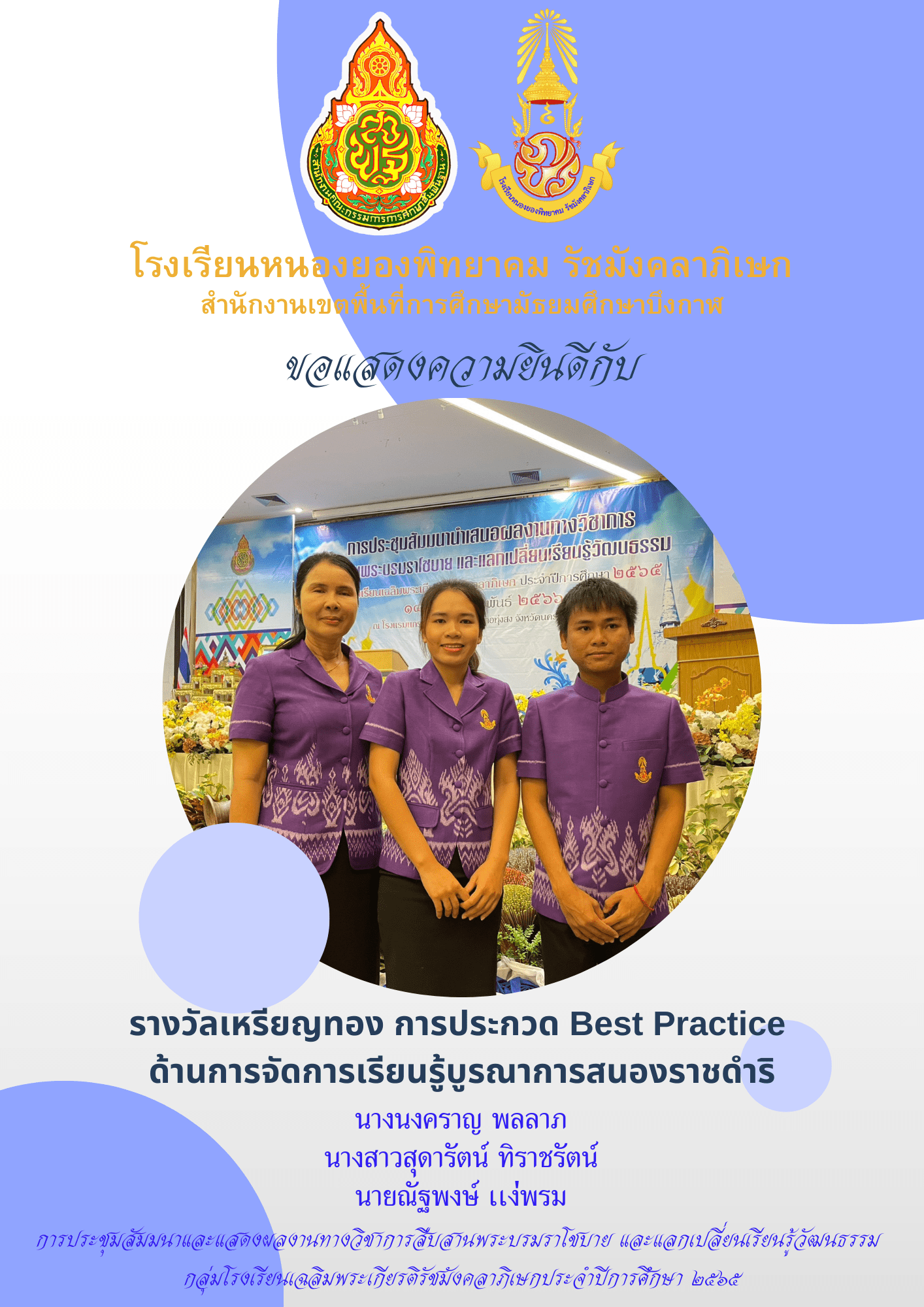 ขอแสดงความยินดีกับนางนงคราญ พลลาภ นางสาวสุดารัตน์ ทิราชรัตน์ นายณัฐพงษ์ เเง่พรม ที่ได้รับรางวัลเหรียญทอง การประกวด Best Practice ด้านการจัดการเรียนรู้บูรณาการสนองราชดำริ |
