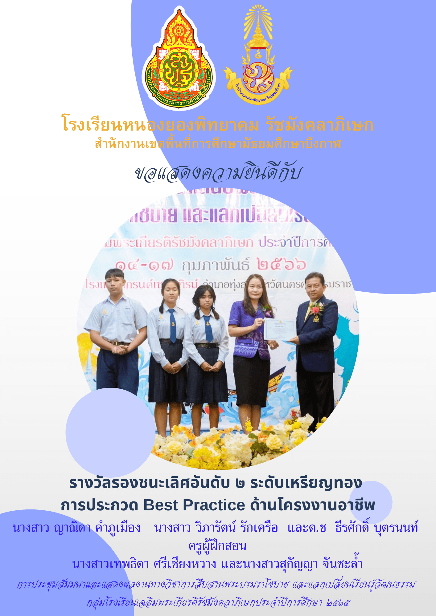 ขอแสดงความยินดีกับนางสาว ญาณิดา คำภูเมือง นางสาว วิภารัตน์ รักเครือ และด.ช ธีรศักดิ์ บุตรนนท์ ครูผู้ฝึกสอน นางสาวเทพธิดา ศรีเชียงหวาง และนางสาวสุกัญญา จันชะล้ำ ที่ได้รับรางวัลรองชนะเลิศอันดับ ๒ ระดับเหรียญทอง การประกวด Best Practice ด้านโครงงานอาชีพ |