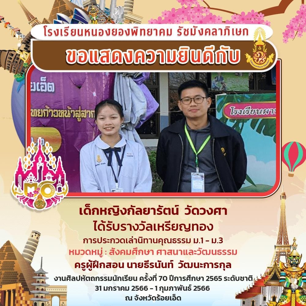 ขอแสดงความยินดีกับเด็กหญิงกัลยารัตน์ วัดวงศา ชั้นมัธยมศึกษาปีที่ 3 ครูผู้ฝึกสอนนายธีรนันท์ วัฒนะการกุล ที่ได้รับรางวัลเหรียญทอง การแข่งขันเล่านิทานคุณธรรม ระดับชั้นมัธยมศึกษาปีที่ 1-3 ในการแข่งศิลปหัตถกรรมนักเรียน ครั้งที่ 70 ปีการศึกษา 2565 ระดับชาติ ระหว่างวันที่ 31 มกราคม 2566 - 1 กุมภาพันธ์ 2566 ณ จังหวัดร้อยเอ็ด |